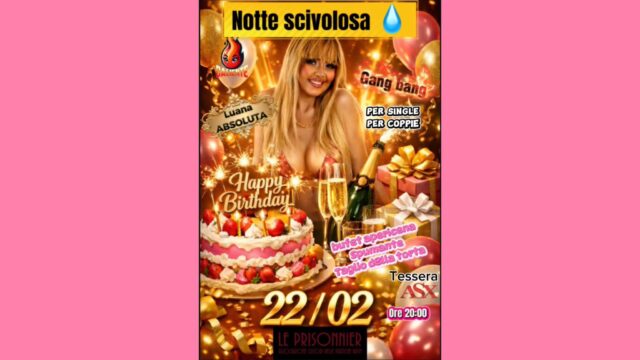 Grande appuntamento in programma per Domenica 22 Febbraio prossimo e denominato “Notte scivolosa”: si tratta del Birthday Party di Luana Absolut, un compleanno caldo, elegante e trasgressivo. Preparatevi a vivere una notte unica, dove erotismo, seduzione e divertimento si fondono in un evento indimenticabuile. Dove? Ma al “Le Prisonnier Club” in via Vergnano, 8 a Brescia, con inizio alle ore 20. Qui trovate l’intervista a Luana (con tutti i dettagli). E qui trovate le informazioni per le coppie e i singoli. Le singole sono ospiti.